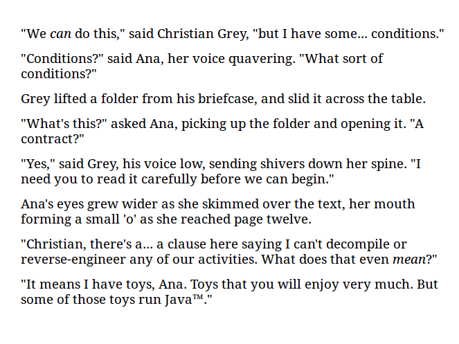 RT @travisgoodspeed: The next version of Oracle’s EULA will surely have a clause outlawing #oraclefanfic. Write some while it’s legal!