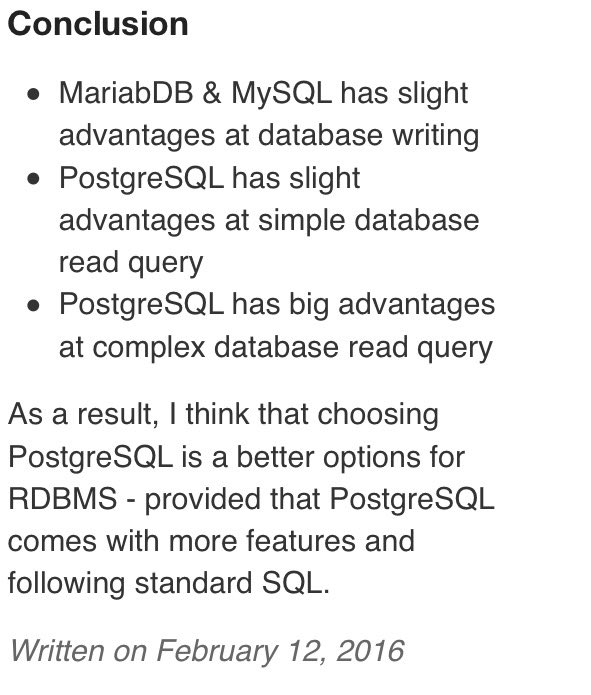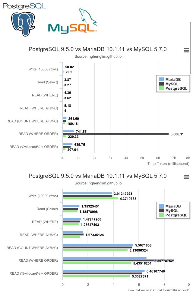 RT @postgresmen: PostgreSQL [9.5.0] vs MariaDB [10.1.11] vs MySQL [5.7.0] year 2016 http://nghenglim.github.io/PostgreSQL-9.5.0-vs-MariaDB-10.1.11-vs-MySQL-5.7.0-year-2016/?time=1