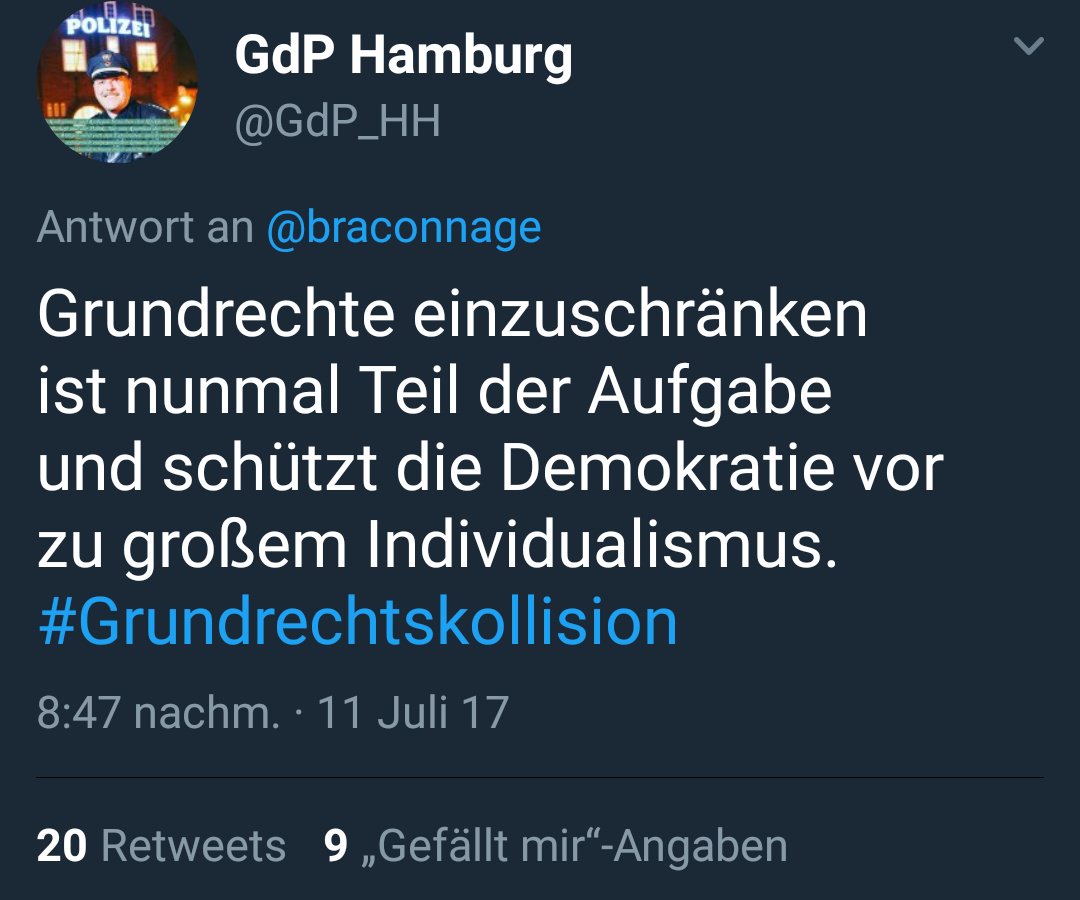 RT @netnrd: Hamburger Polizei hat Rechtsstaatlichkeit aufgegeben. Antragstellende Anwälte seien “gefährlich”,weil RAV-Mitglieder https://t.…