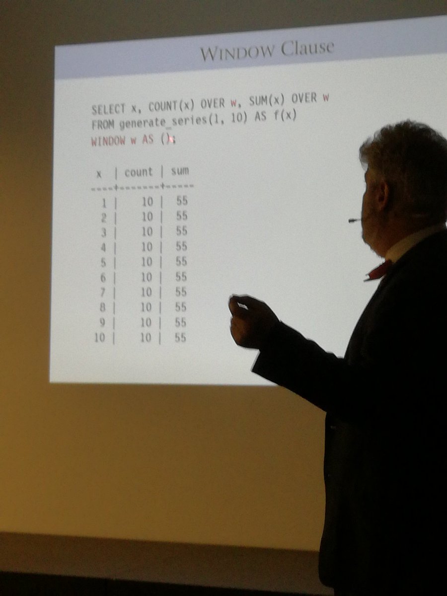 WINDOW keyword in #SQL Bruce Momjian explaining #PostgreSQL window functions at the #Berlin Meetup at @ZalandoTech