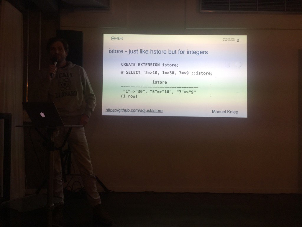 RT @hintbits: Manuel Kniep from Adjust talks about istore #PostgreSQL #Berlin