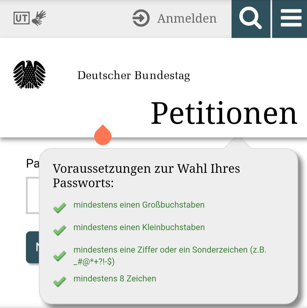 @ennolenze Passwort ändern: Bitte geben Sie Ihr Passwort ein (mindestens 8 Zeichen, und mindestens je einen Groß- und Kleinbuchstaben sowie eine Ziffer oder ein Sonderzeichen avJ4}C#q3Qt! Da kommt ohne Rückmeldung das Anmeldeformular 😠
