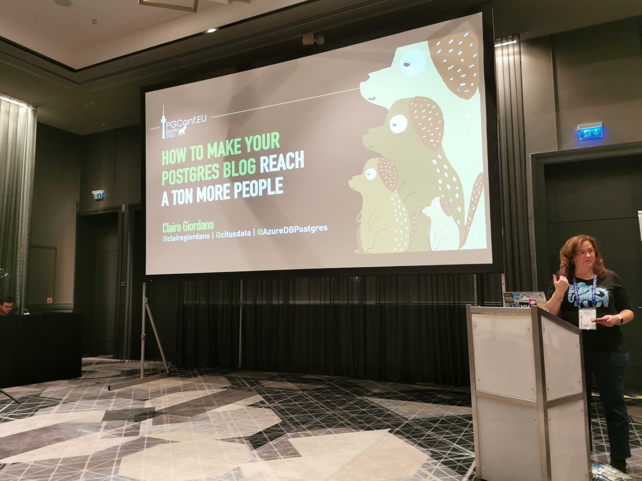 @clairegiordano will start soon with her talk about how to make Postgres blog reach a ton more people #pgconfeu